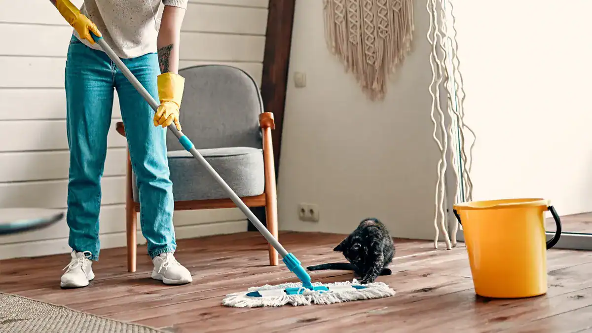 選擇適合地板材質的清潔劑拖地,並用抹布補充清潔拖把難以觸及的角落。